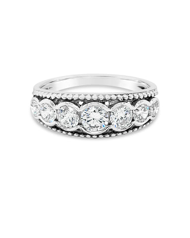 Traditional 5 stone eternity ring featuring 1 x 6mm centre stone, 5mm stones either side with a 4mm stone to the outer.